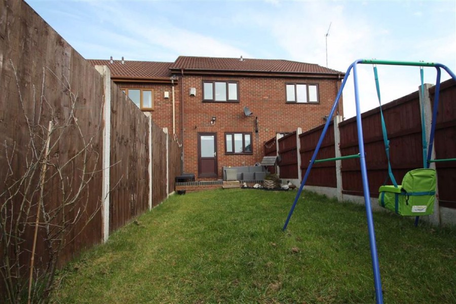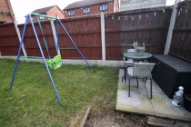 Rear: With raised patio area leading to lawn and on to further patio area at the rear and access gate to road behind.