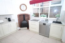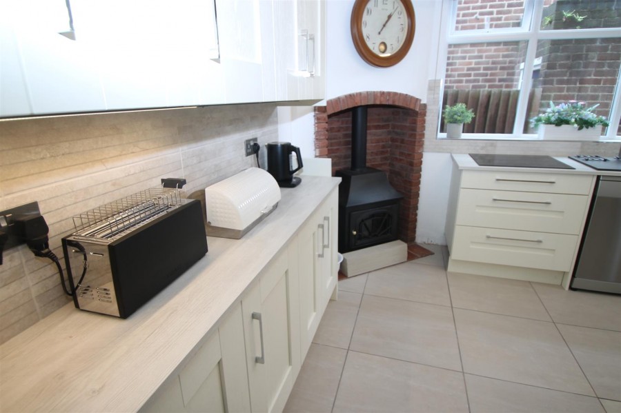Having matching wall and base units with worktops over, single sink unit, double sink unit, AEG branded electric hob, AEG branded five ring gas hob, Miele branded extractor over, Integrated AEG branded oven, plumbing for dishwasher, feature fireplace with gas fire, central heating radiator, splash back tiling, ceramic tiled flooring, double glazed windows to side and rear elevation and access into: